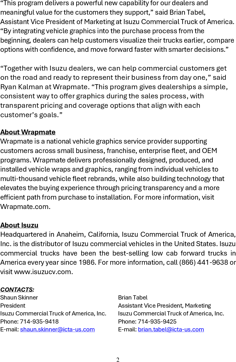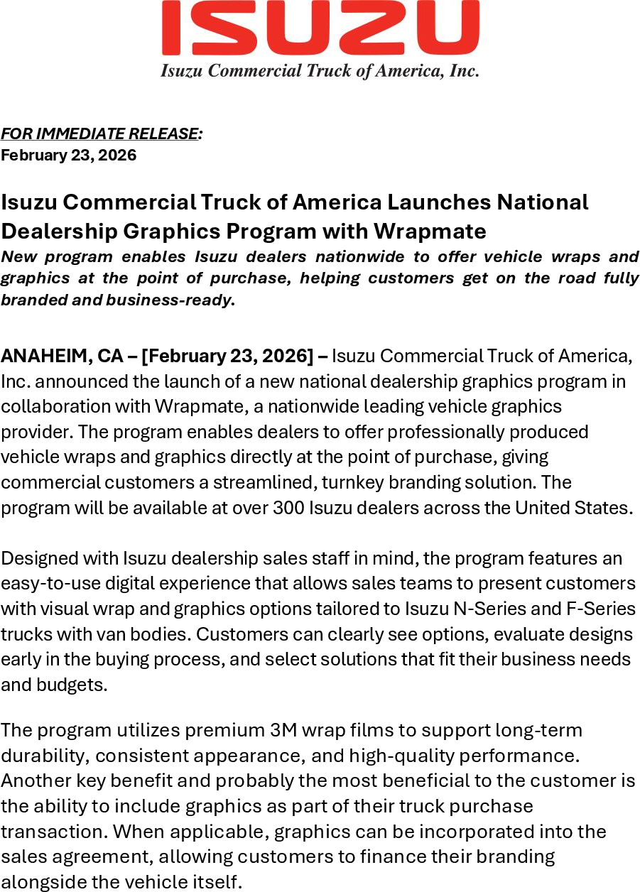 - 02/23/2026Isuzu Commercial Truck of America Launches National Dealership Graphics Program with Wrapmate